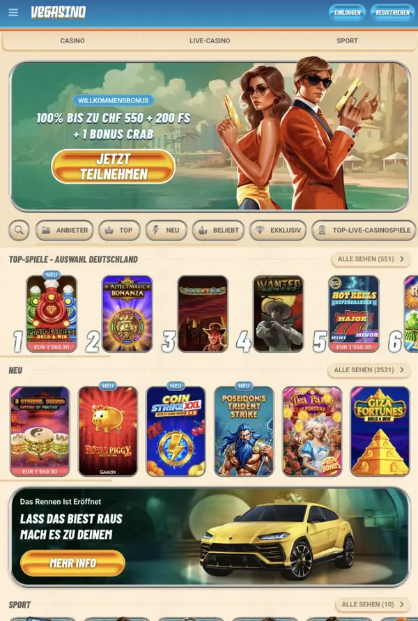 Wir bieten eine große Bibliothek mit Vegasino Slots, Live-Casino-Tischen, klassischen Tischspielen, Jackpots und Instant Games. Bei vielen Titeln kannst du außerdem den Demo-Modus nutzen, um Regeln und Features zu verstehen, bevor du mit Echtgeld spielst. Bei manchen Spielen kann der Demo-Modus durch Anbieter-Einstellungen oder lokale Einschränkungen begrenzt sein, aber wir halten die Option dort verfügbar, wo es möglich ist.